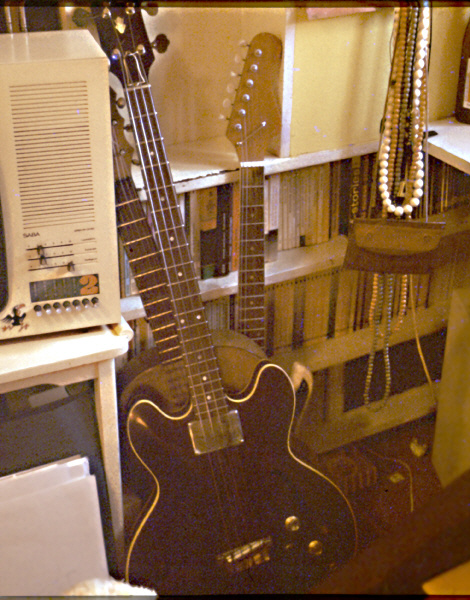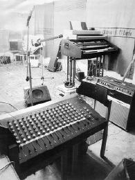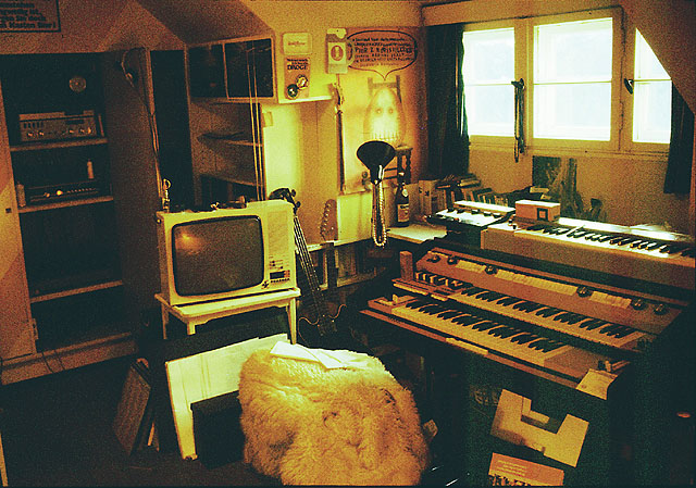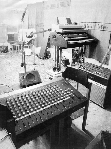 Das Foto zeigt nochmal schön das von Peter Gröllmann gebaute Mischpult. Rechts stehen die Keyboards Böhm-Orgel, Pianet und String Vox.