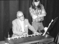 Einer der agilen Senioren langt beherzt in die Tasten des Hohner Combo Pianet von Zelta Zonk und Andreas macht den aufmerksamen Notenblätterer.