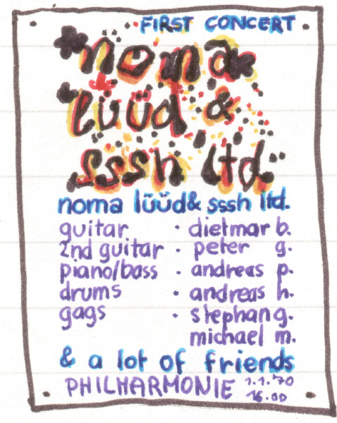 Die anfangs namenlose Band der dreizehnten Klasse experimentiert ab Mitte 1969 mit Blues und improvisierten, freien Ein-Akkord-Stücken, die von Amon Düül und von Ten Years After inspiriert sind. Aus dieser Zeit hat sie den Arbeitstitel Noma Lüüd & Sssh Ltd., was die einflussgebenden Elemente wohl eindeutig widerspiegelt.