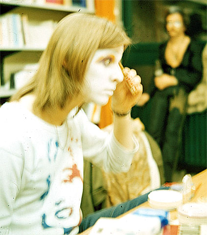 Das Bild zeigt Andreas beim Schminken, im Hintergrund lehnt Bernd im Glam-Outfit. Andreas trägt ein selbstgefertigtes Zelta Zonk Sweatshirt mit "Maskottchen" Marilyn als Motiv.