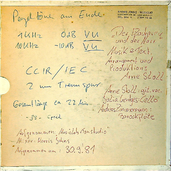 Nachfolgend schafft er den Songzyklus "Der Zauberer und der Narr", den er dann im September 1981 ebenfalls im Musiclab Tonstudio von Harris Johns aufnimmt und produziert. Zur Zeit existiert zwar bereits die originale Hülle zu der 38 cm/s Version, doch das wichtige Band selber ist noch verschollen ... Wer eine Kopie hat oder kennt: Bitte melden!