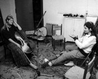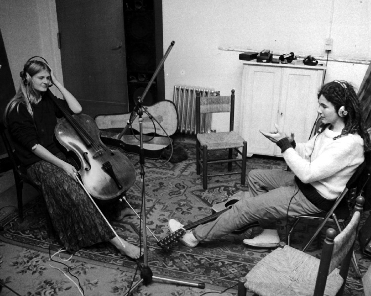 Er spielt alle Gitarren und singt, Julia Gentges spielt Cello und Andreas Zimmermann Barockflöte -- das Foto zeigt Julia und Arne während der Aufnahmen.